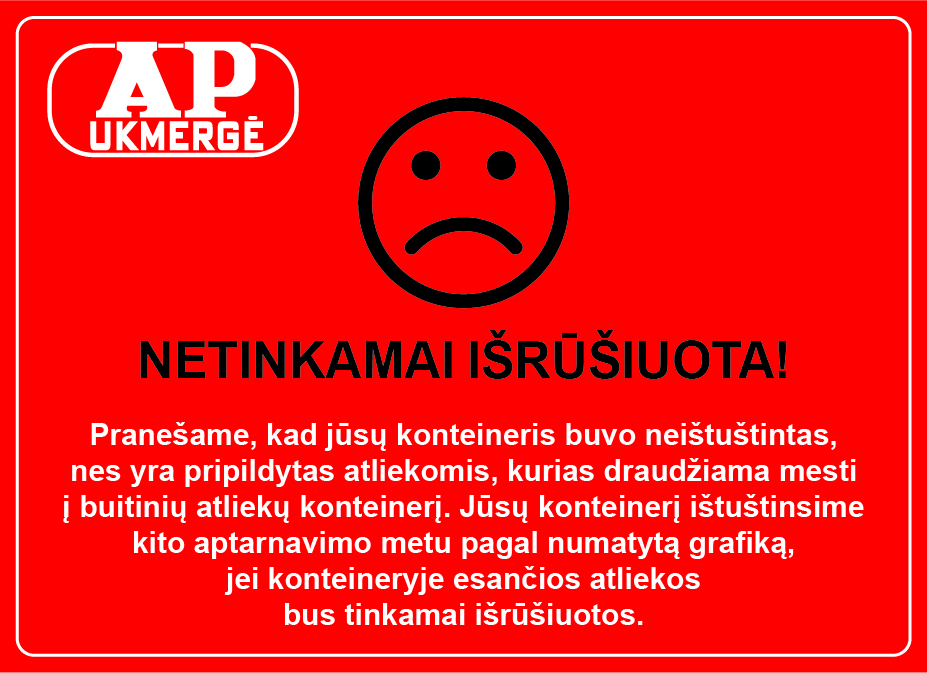 Jei patikrinimo metu bus nustatyta, kad individualiai priskirtame atliekų konteineryje yra žaliųjų atliekų, toks atliekų konteineris nebus ištuštintas. Ant konteinerio dangčio bus užklijuotas įspėjamasis lipdukas su detalia informacija, kaip ir kur tinkamai tvarkyti žaliąsias atliekas. Konteineris bus ištuštintas tik sekančio aptarnavimo metu gyventojams tinkamai išrūšiavus susidariusias atliekas.